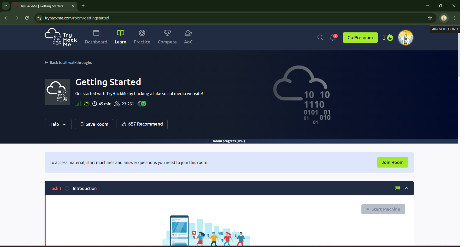 The first step begins by navigating to the Getting Started Lab on Try Hack Me. Once the lab page opens, clicking on the Join Now button starts the room. This action registers your participation and unlocks the tasks associated with the lab.