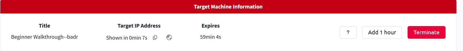 Once both the machine and Attack Box are running, an IP address appears at the top of the room. This IP address represents the target web application hosted by the lab environment and is required to access the website.