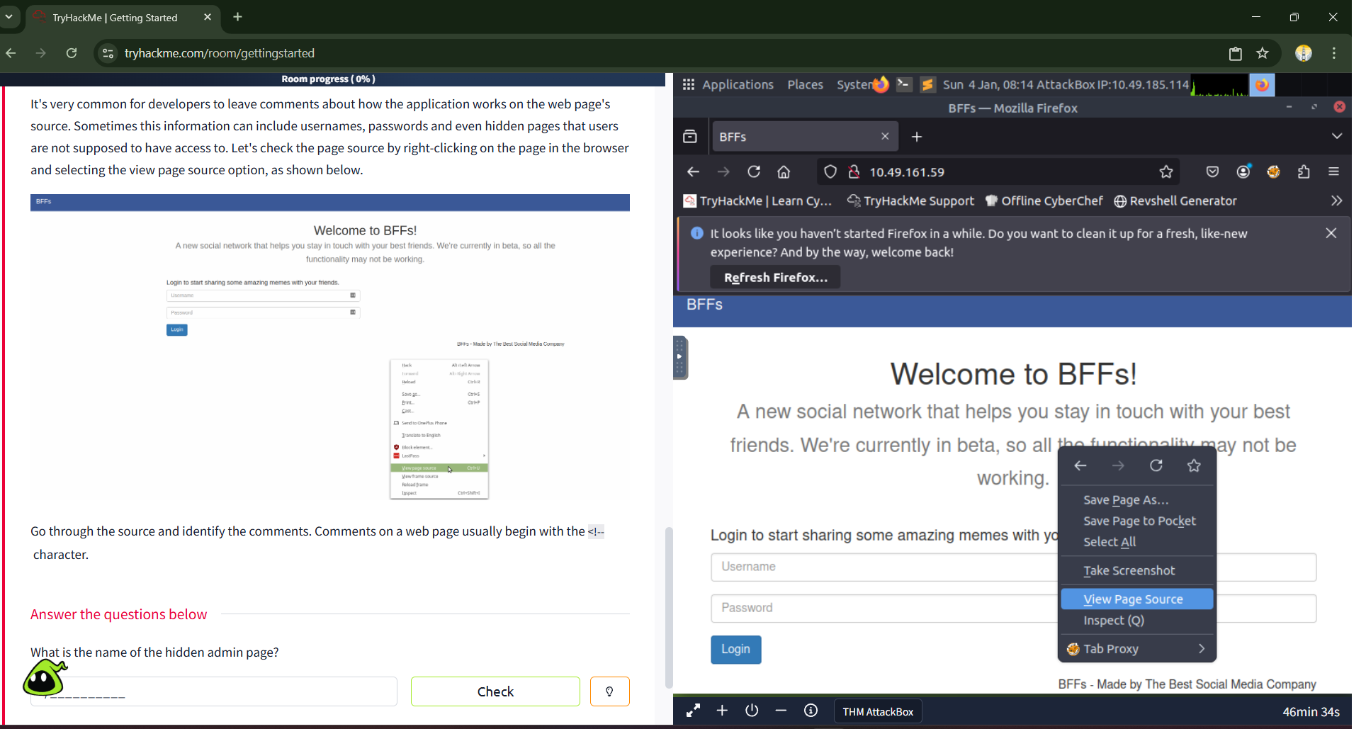 Once the website loads, it displays the BFFs Social Media Page. At first glance, the page appears simple and normal. However, hidden information often exists beneath the surface. By right-clicking on the page and selecting View Page Source, the HTML source code of the page becomes visible.