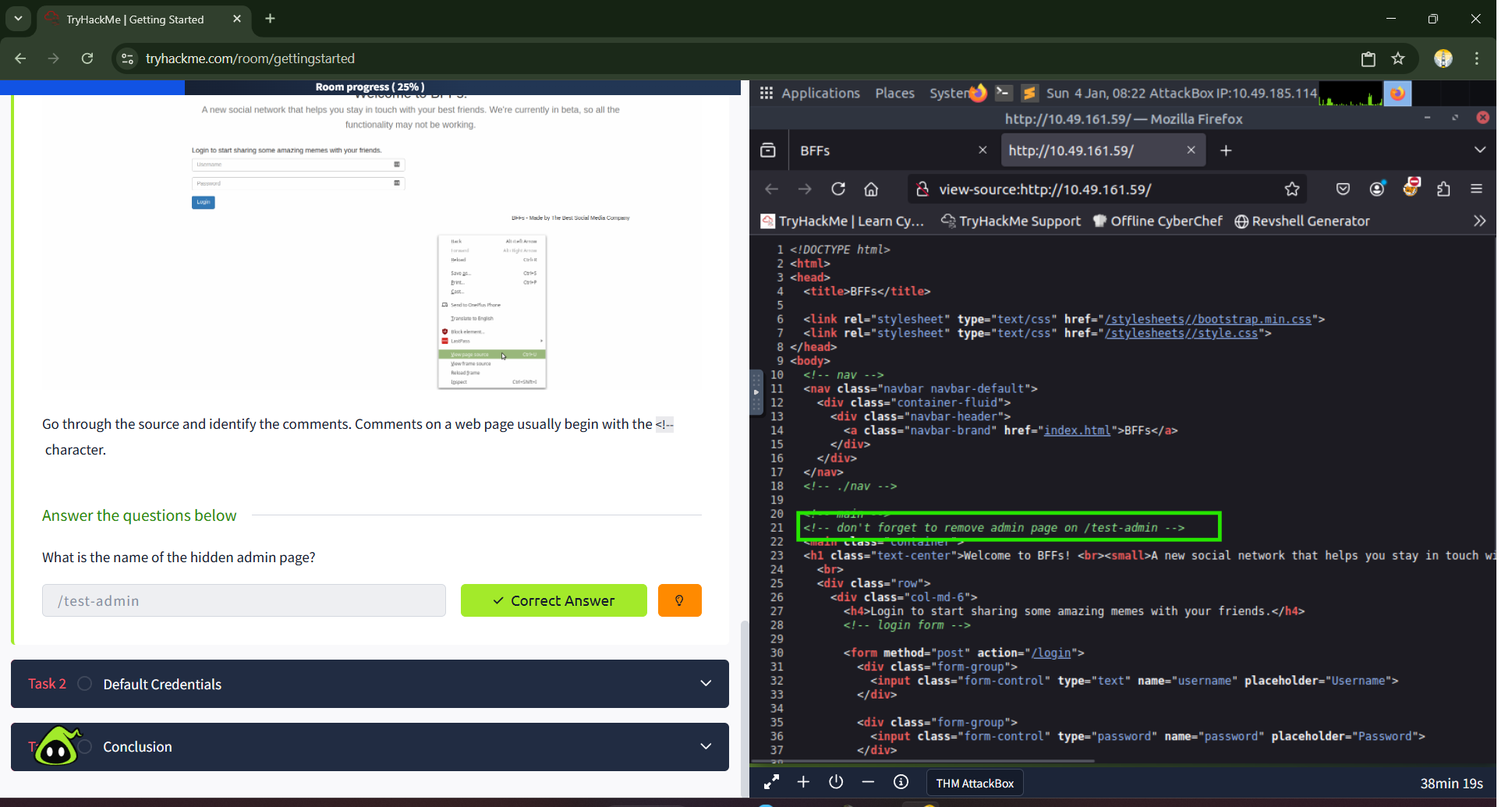 While reviewing the source code, comments are identified. HTML comments typically begin with <!-- and end with -->. These comments may contain sensitive information that developers unintentionally leave behind. In this lab, the comments reveal valuable clues related to hidden or restricted pages. The identified information is copied and pasted into Task 1 as the correct answer.